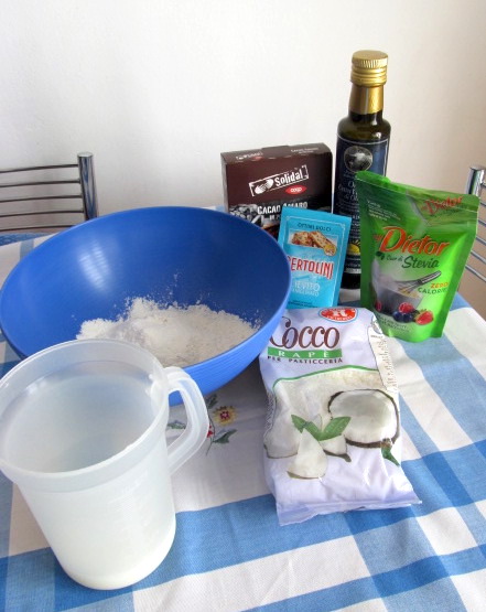 In una terrina mescolate la farina precedentemente setacciata con il lievito, il Dietor Cuor di Stevia e la farina di cocco e il cacao (se lo gradite). Aggiungete l’olio e il latte continuando a mescolare.
