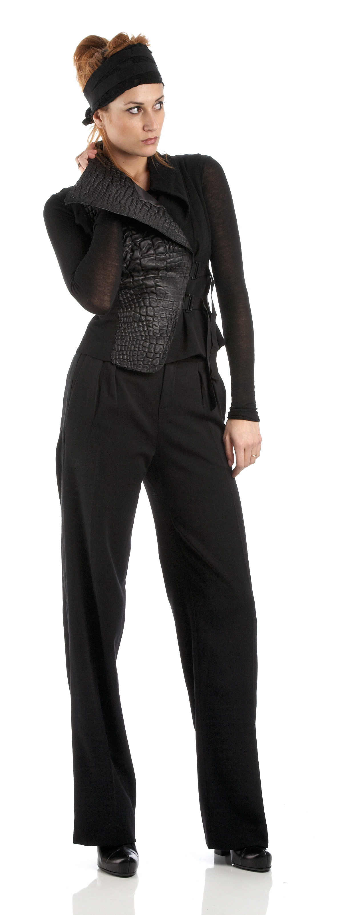 Altro capo di cui non potremo fare a meno è il chiodo che Malloni reinterpreta conferendo alla pelle una lavorazione speciale, effetto coccodrillo, ottenuta mediante la sovrapposizione di due strati di pelle.