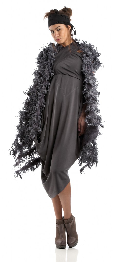Nella foto la pelliccia di lana e seta con fili fluttuanti lavorata a mano con la tecnica dei filati impastati tra loro.