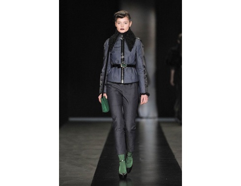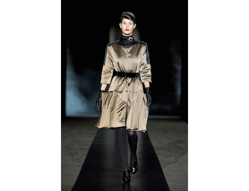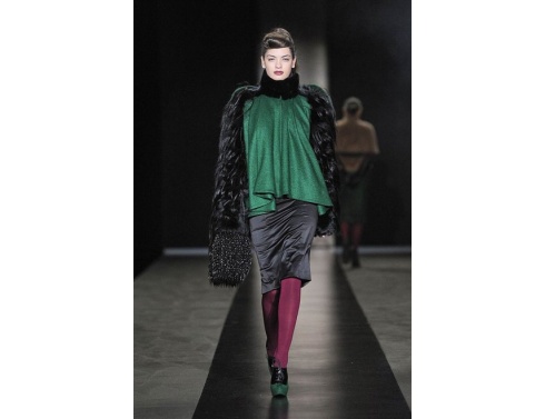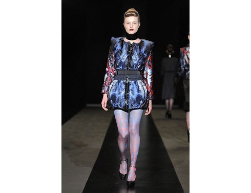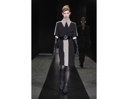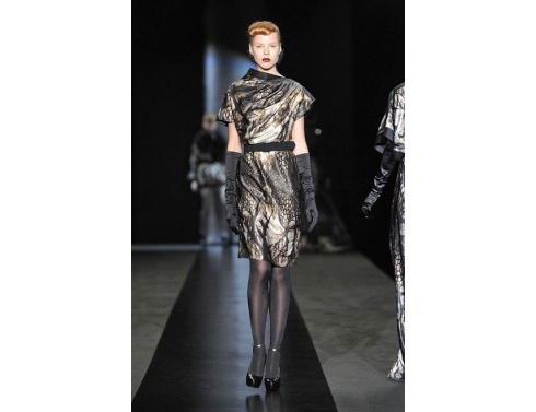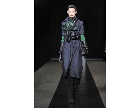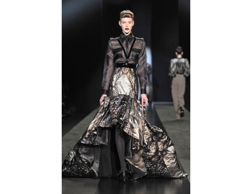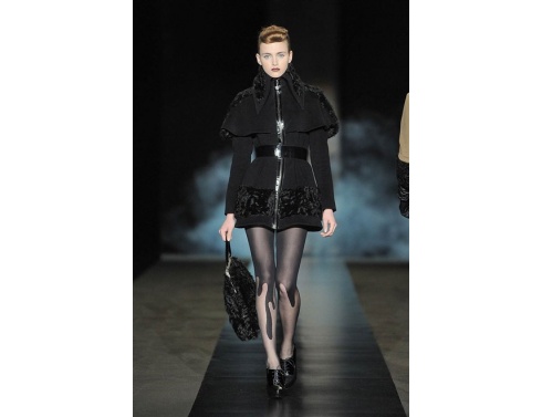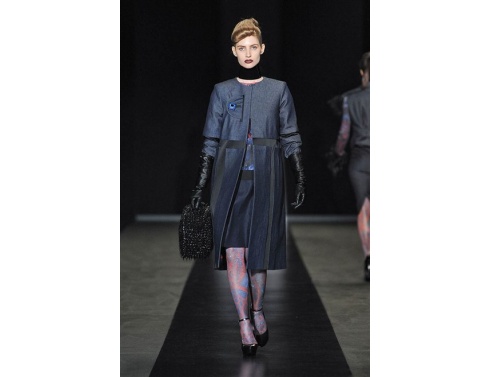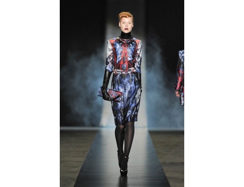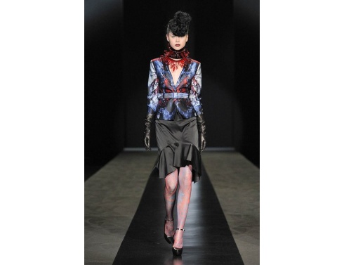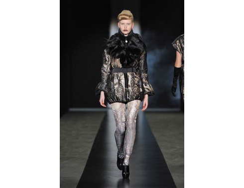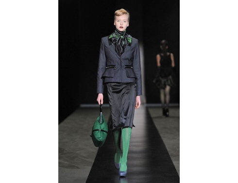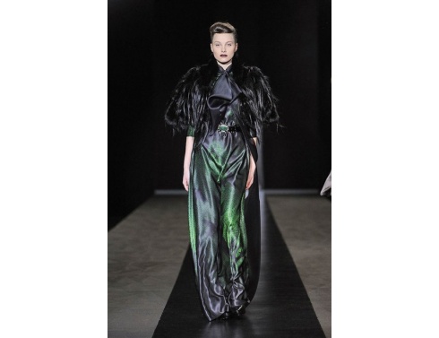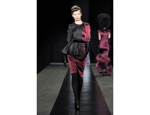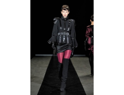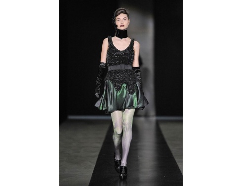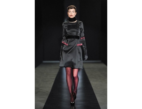 Ancora il rigore degli anni ’40 ma, in una veste diversa da quella vista sulle altre passerelle, con l’aggiunta di pathos nelle stampe e nei dettagli. Accessori a forma di aerei, gocce di silicone lucido nero per donare un effetto 3D a borse, corsetti e colletti realizzati da Marcello Gobbi, scarpe altissime e tacchi a spillo firmati Sergei Grinko by Isabella Lo Russo.