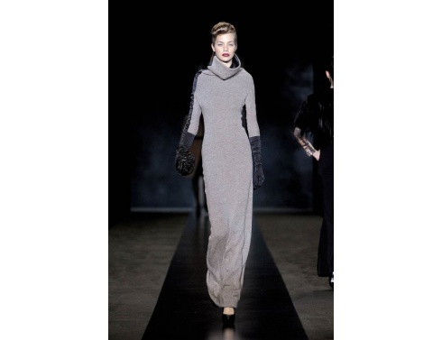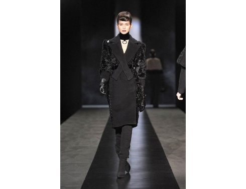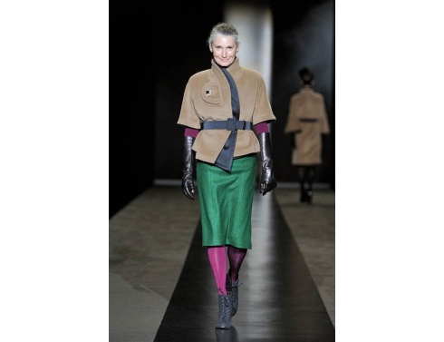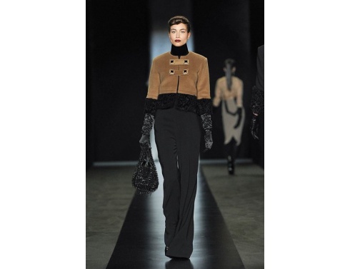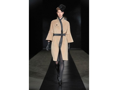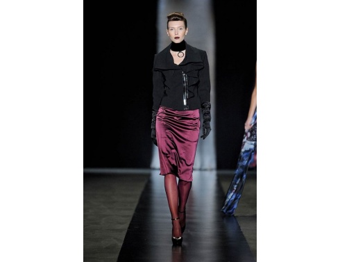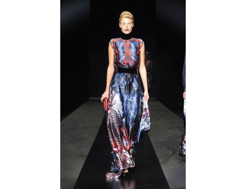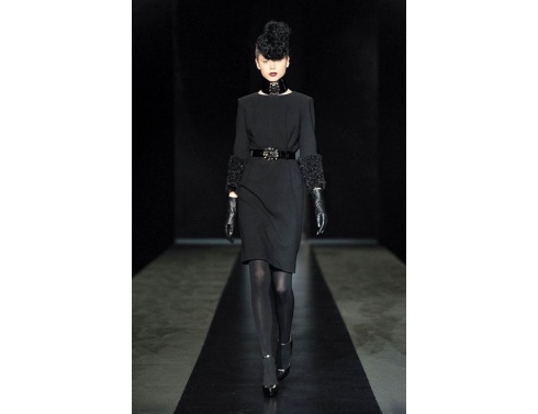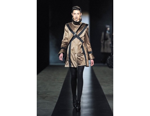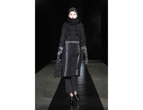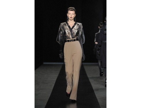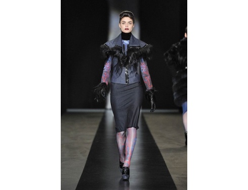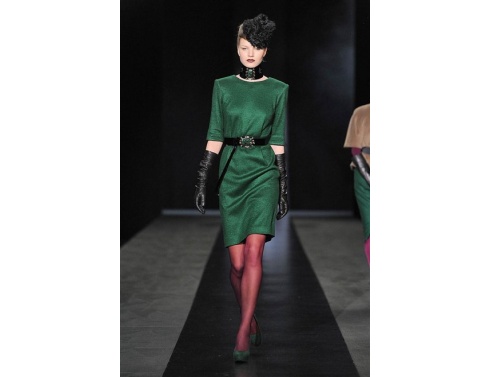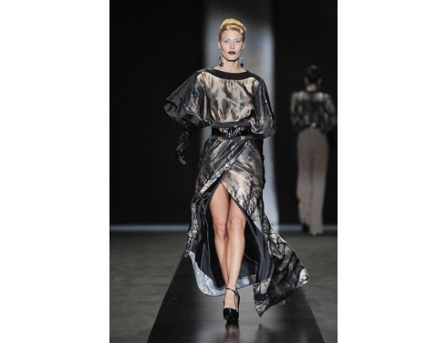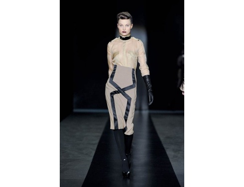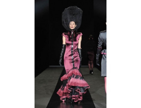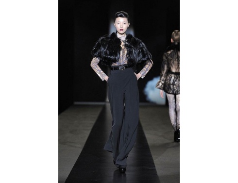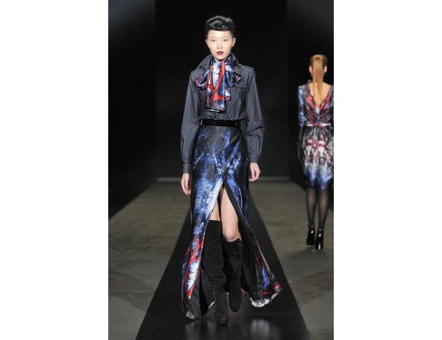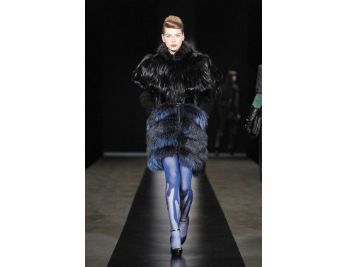 Ancora il rigore degli anni ’40 ma, in una veste diversa da quella vista sulle altre passerelle, con l’aggiunta di pathos nelle stampe e nei dettagli. Accessori a forma di aerei, gocce di silicone lucido nero per donare un effetto 3D a borse, corsetti e colletti realizzati da Marcello Gobbi, scarpe altissime e tacchi a spillo firmati Sergei Grinko by Isabella Lo Russo.