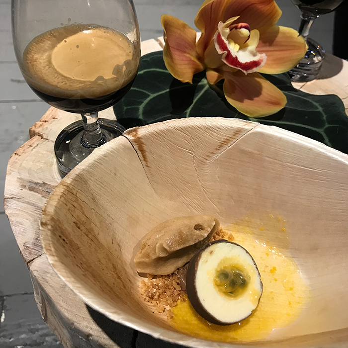 Semifreddo al cioccolato con frutto della passione e sorbetto al caffè abbinato ad Arabica Ethiopia Harrar.