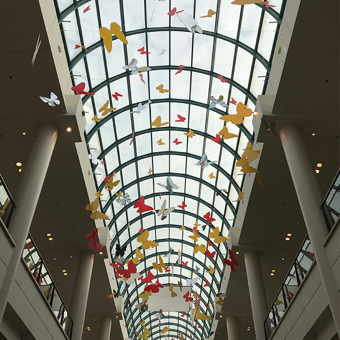 Appena entrata a Oriocenter sono stata piacevolemte colpita dalla presenza di luce naturale, che filtra dal tetto della galleria principale, e da un’istallazione di farfalle che mi “svolazzavano” sopra la testa. In genere la luce artificiale dei centri commerciali mi deprime un po’ ma l’atmosfera di Oriocenter è tutta un’altra storia.