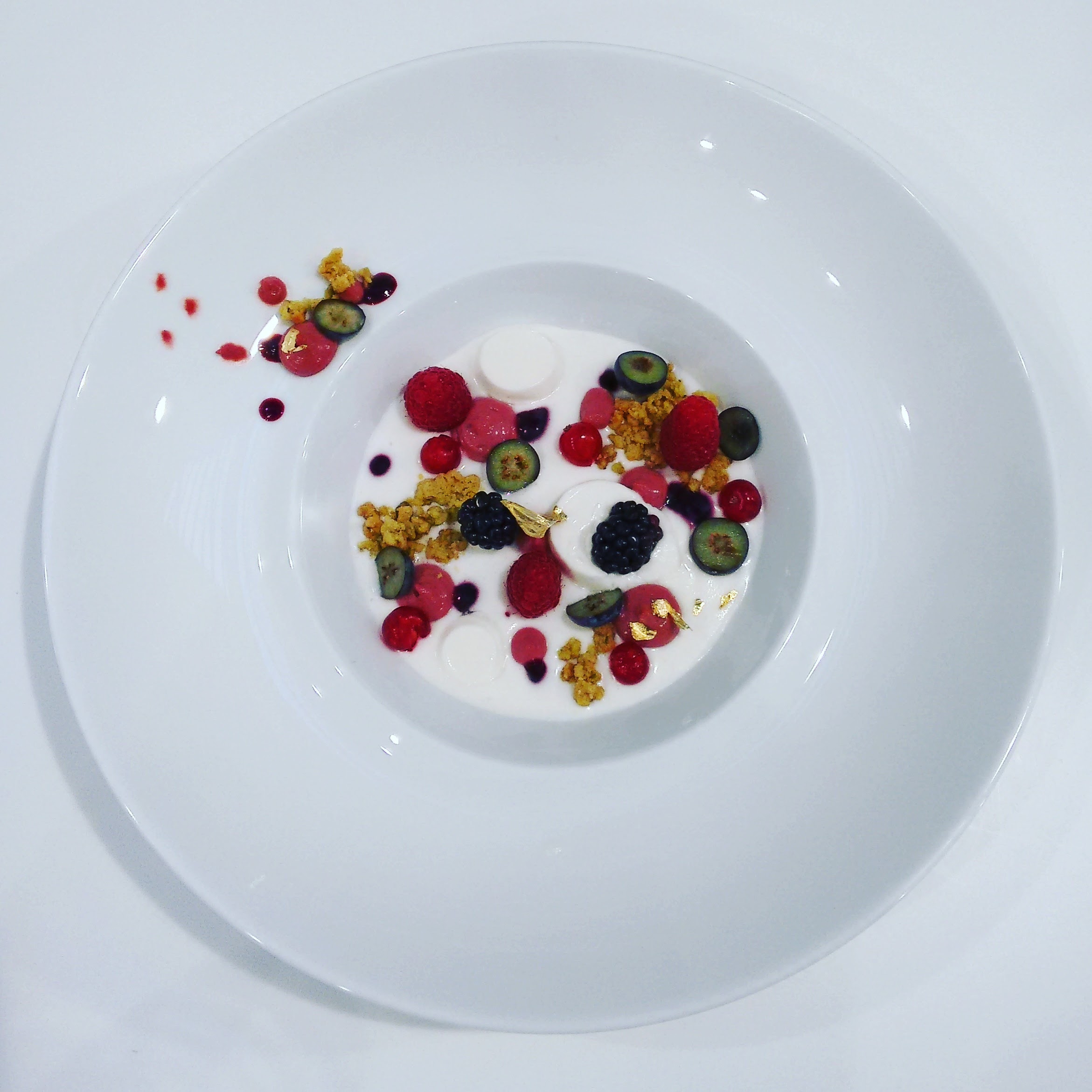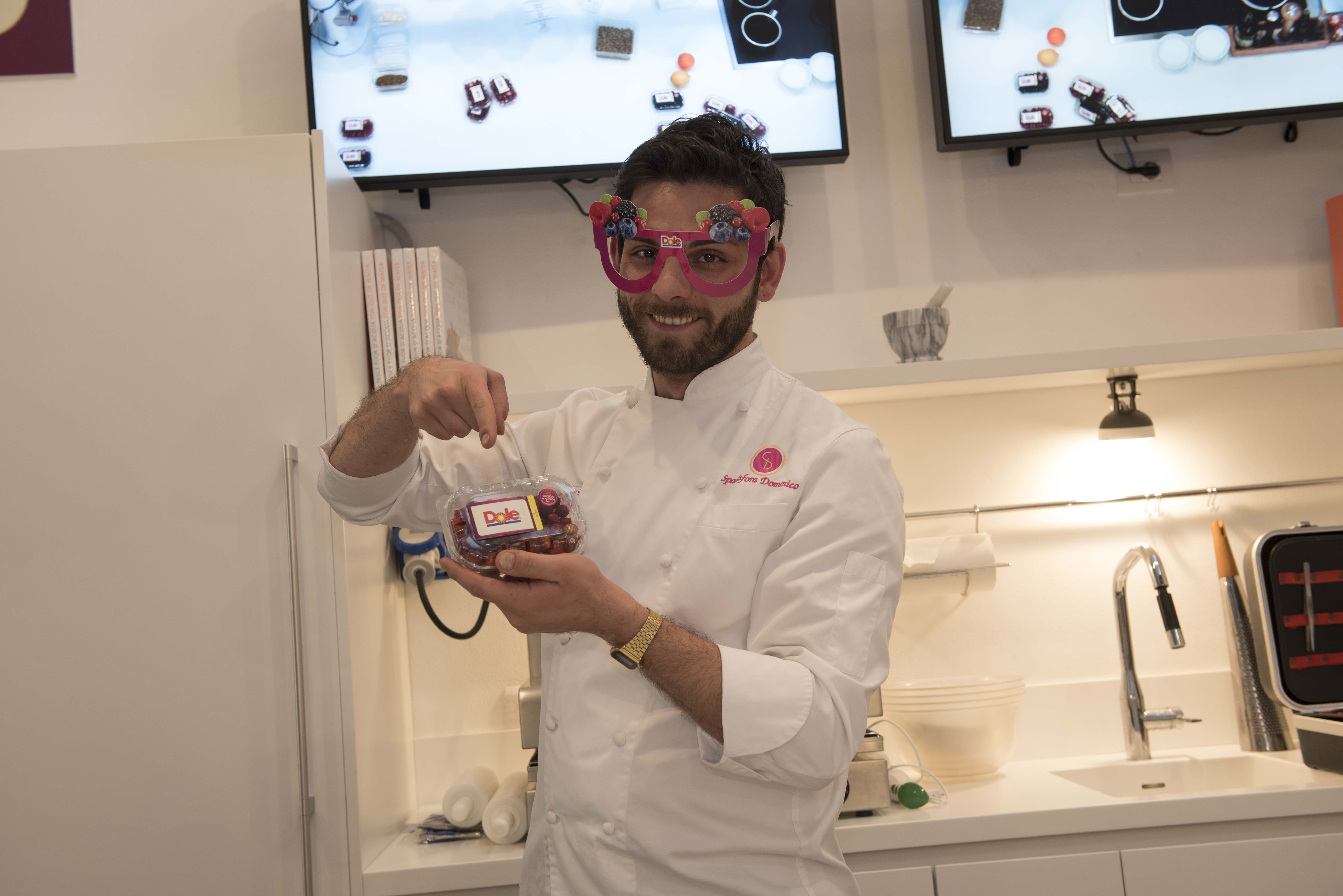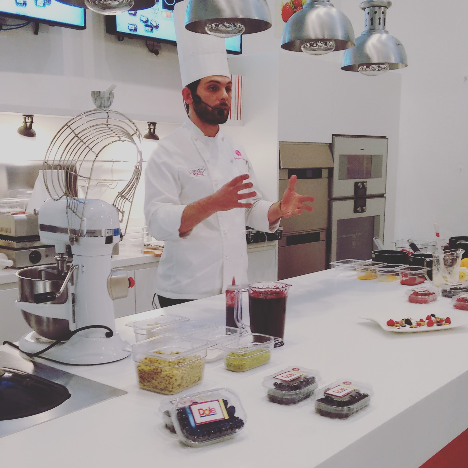 Al termine del seminario sui berries, lo Chef Pâtissier Domenico Spadafora (che molti di voi conosceranno per la sua partecipazione al programma Detto Fatto, in onda su Rai2) ci ha proposto uno showcooking colorato durante il quale ha preparato un piatto delizioso, per il palato e per gli occhi, che prevede il coinvolgimento di tutti e cinque i frutti di bosco. Lo Chef ha fatto risaltare il gusto di ciascuno dei frutti  di bosco con una crema bianco mangiare, una centrifuga di frutti rossi e zenzero e una frolla al pistacchio salato. Il risultato? Un dolce al cucchiaio dal retrogusto salato.